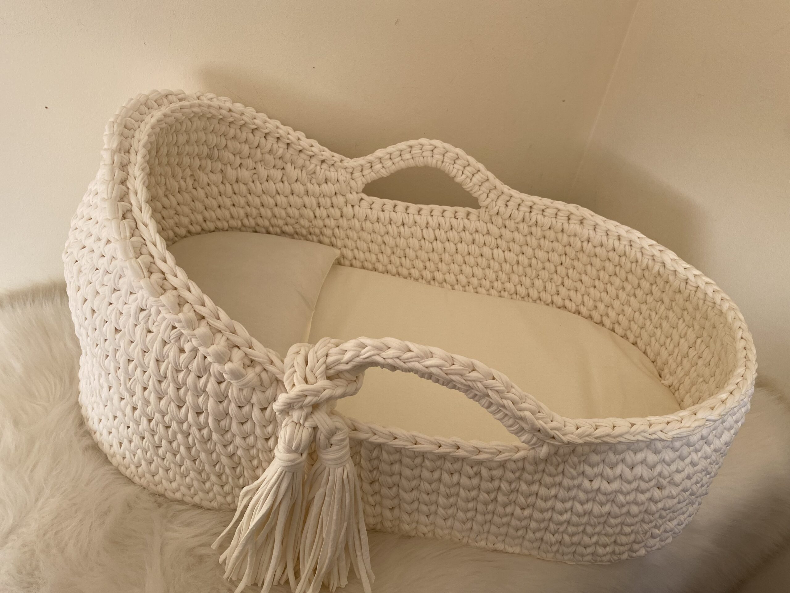 un patron détaillé qui vous explique toutes les étapes à suivre pour réaliser un couffin bébé ou berceau bébé en crochet avec une base en bois. La dimension du couffin est de 70*35cm hauteur environ 32cm